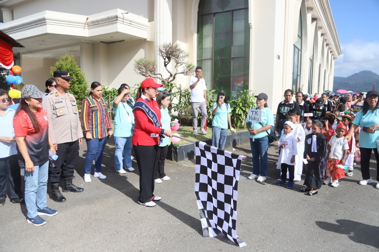 AMBON, PPID – Bunda PAUD Kota Ambon, Lisa Wattimena, secara resmi membuka kegiatan Karnaval Taman Kanak-Kanak yang diselenggarakan oleh Ikatan Guru Taman Kanak-Kanak Indonesia (IGTKI) dan Persatuan Guru Republik Indonesia (PGRI) Kecamatan Nusaniwe, di halaman Katolik Center Ambon, Jumat (12/9/25)