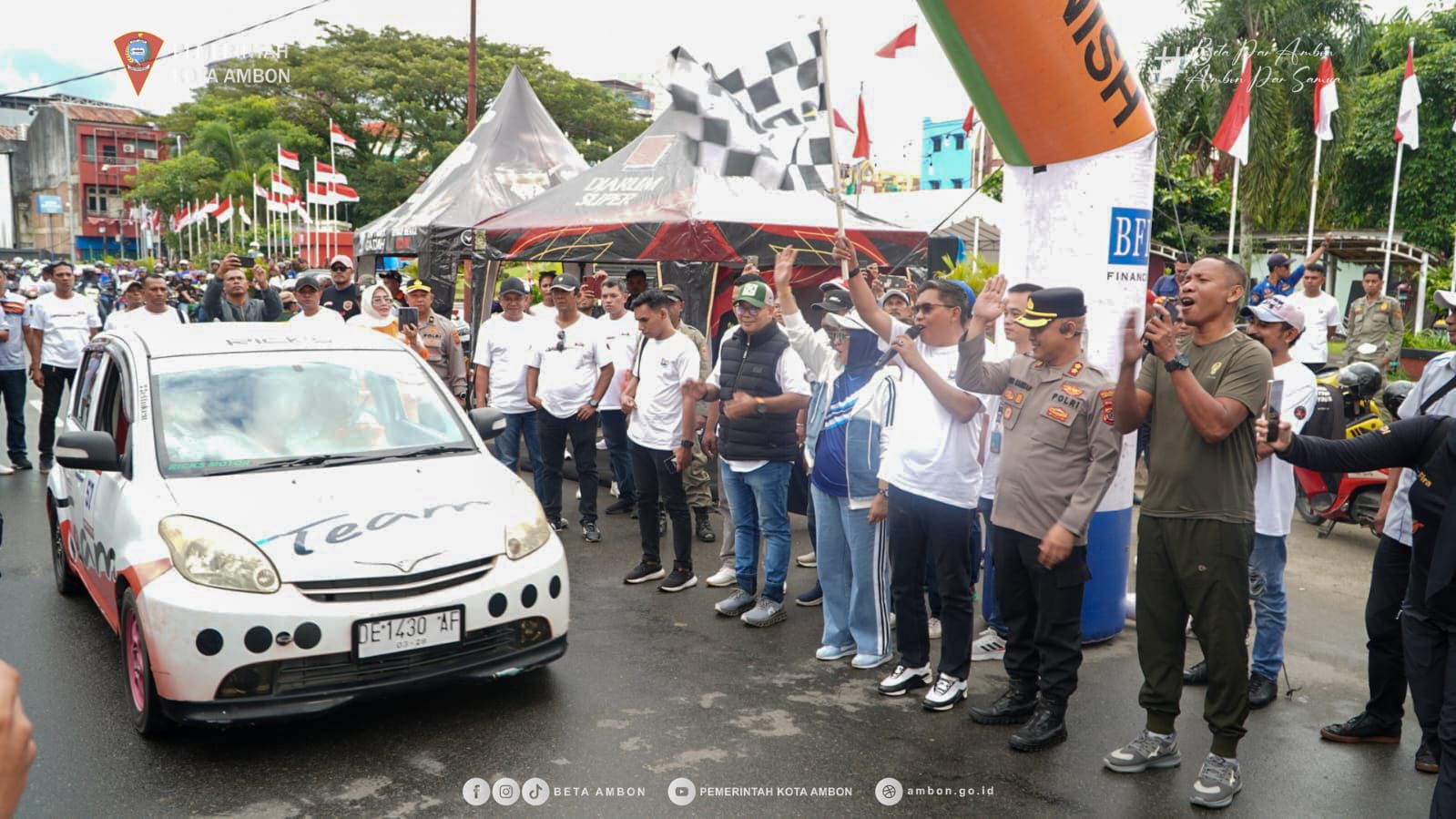 AMBON,PPID – Wali Kota Ambon, Bodewin M. Wattimena melepas peserta Amboina City Rally Tahun 2025, Sabtu (30/8/25), di depan Monumen Gong Perdamaian Dunia.