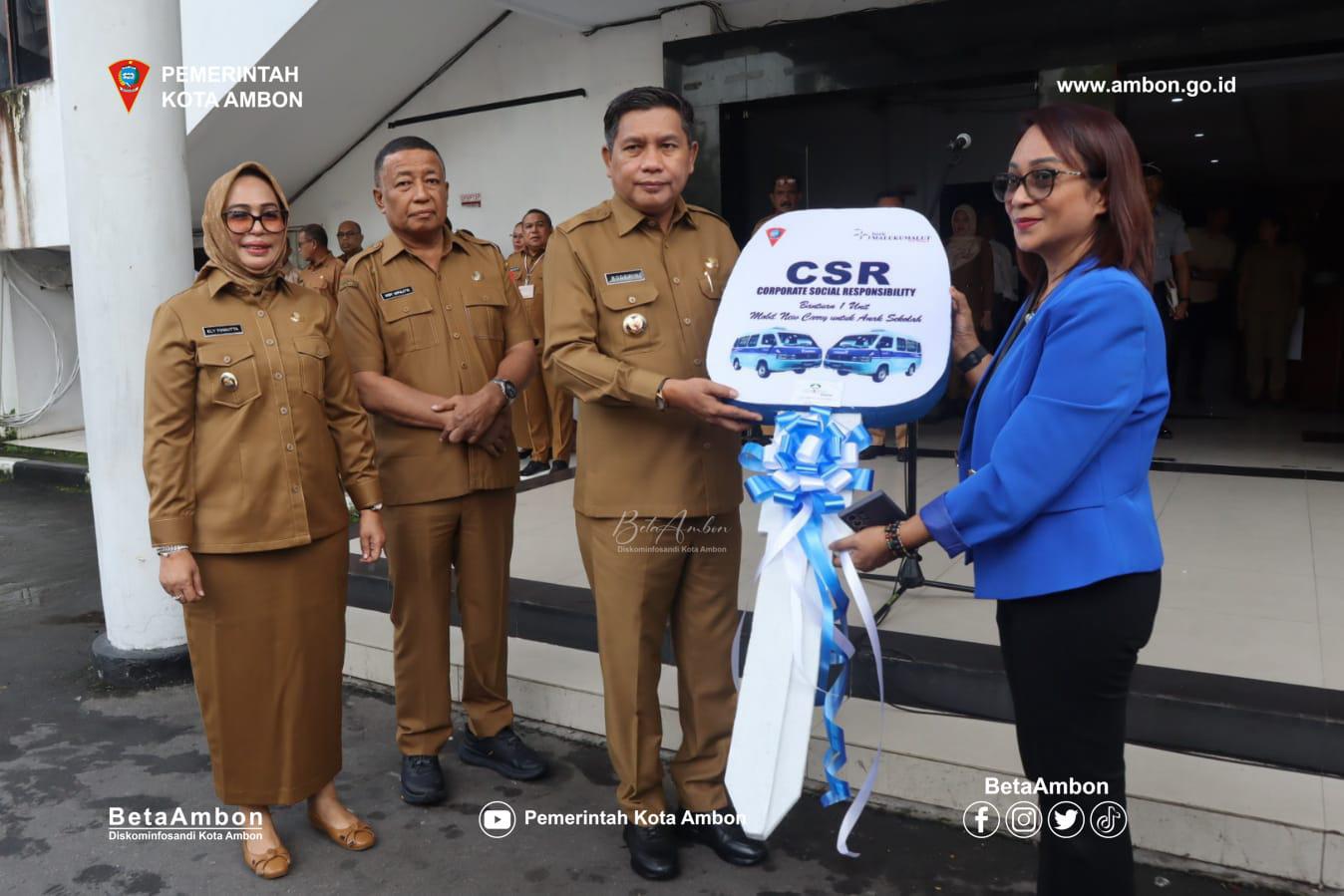 AMBON,PPID – Wali Kota Ambon, Bodewin Wattimena menerima satu unit mobil transportasi Pendidikan melalui program Corporate Social Responsibility (CSR) Bank Maluku-Maluku Utara (Malut) yang diberikan secara langsung oleh Kepala Cabang Utama Bank Maluku-Malut Trientje Siahanenia, di Halaman Apel Balaikota Ambon, Senin (23/6/25)