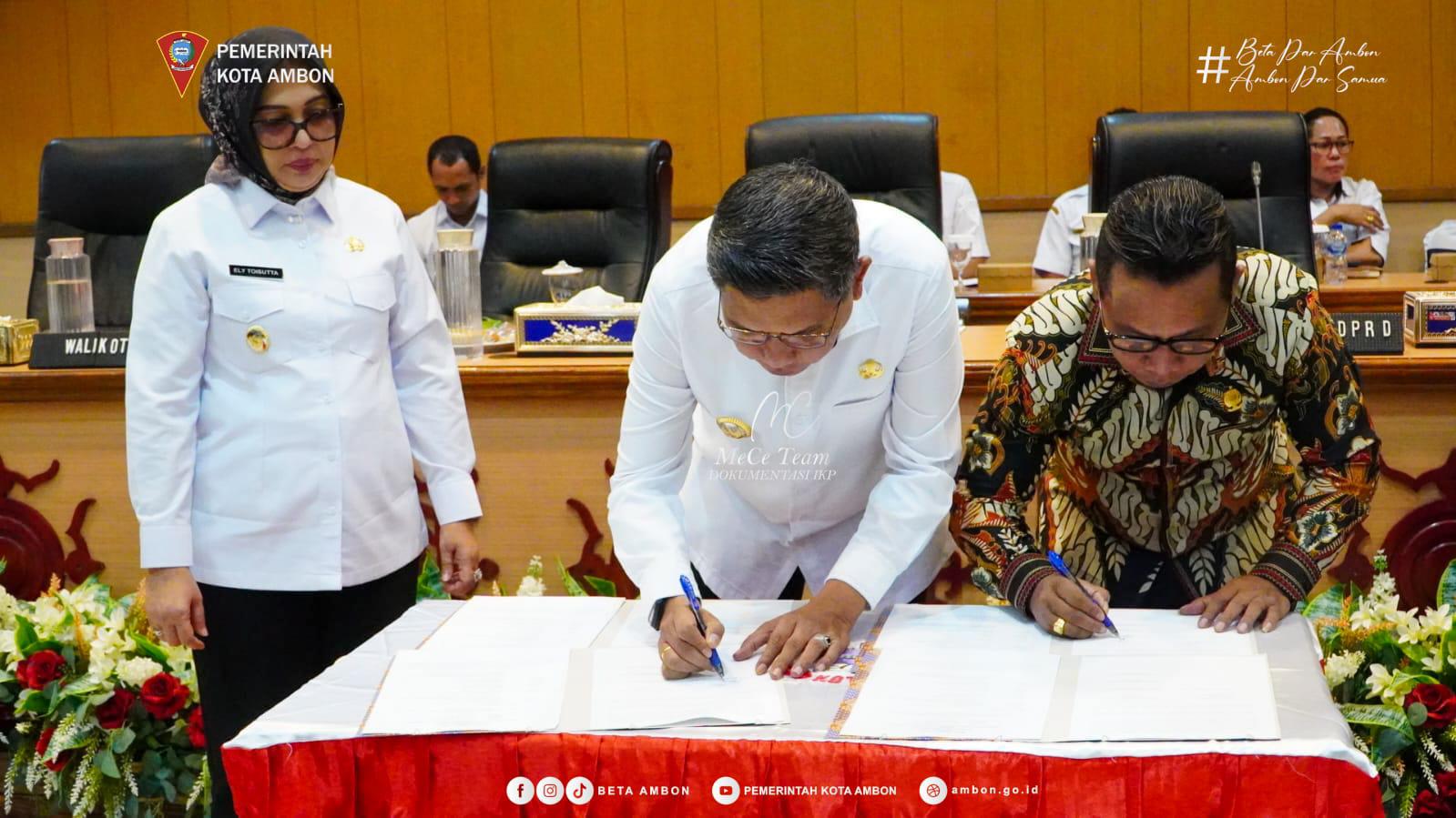 Penandatanganan ini dilaksanakan dalam rapat paripurna di Ruang Sidang Utama DPRD Kota Ambon pada Rabu, (23/7/25).