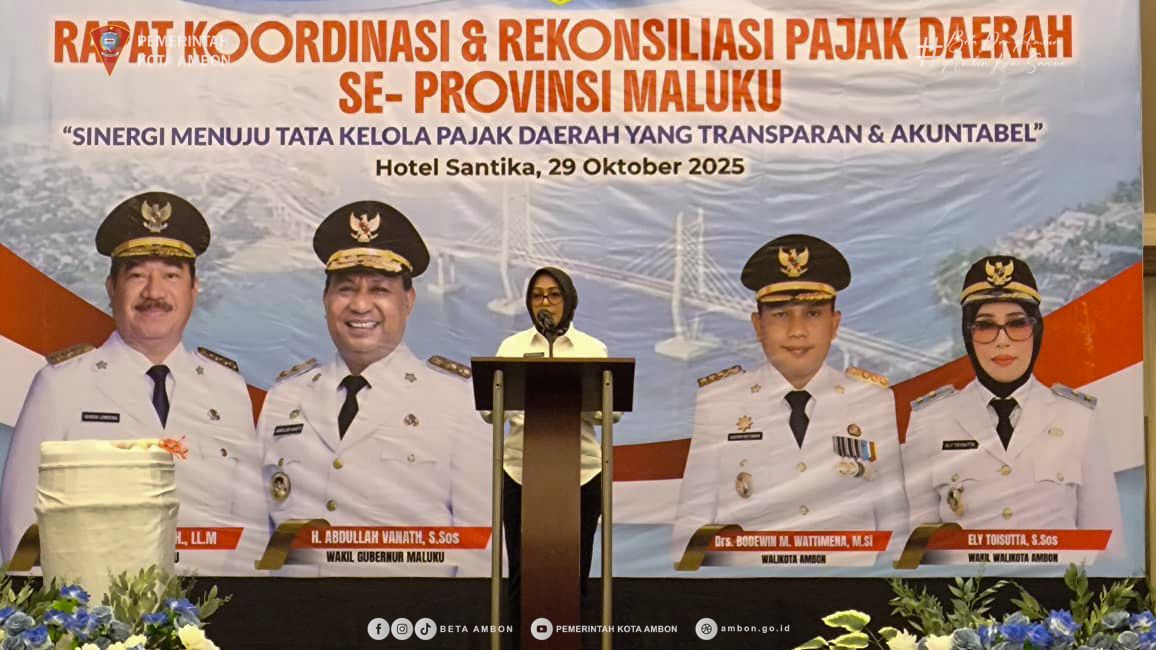 AMBON, PPID – Guna memperkuat kemandirian fiskal daerah melalui langkah strategis optimalisasi Pendapatan Asli Daerah (PAD), Wakil Wali Kota (Wawali) Ambon, Ely Toisutta, menghadiri Rapat Koordinasi dan Rekonsiliasi Pajak Daerah se-Provinsi Maluku yang digagas oleh Pemerintah Provinsi Maluku, di Hotel Santika Ambon, Rabu (29/10/25)